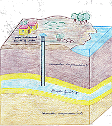 * Os poços profundos captam a água do lençol localizado entre duas camadas impermeáveis do solo. Esses poços exigem perfuração profunda, e a água é retirada por meio de tubos. Em geral, ela é de boa qualidade, mas é conveniente fazer um exame antes de usá-la, pois pode conter excesso de sais minerais ou mesmo estar contaminada. Como a instalação desse tipo de poço é muito cara, ele é mais usado no abastecimento de cidades ou de núcleos industriais.